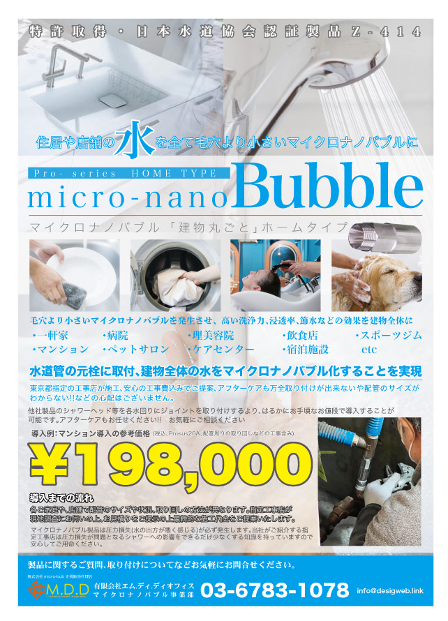 話題のマイクロナノバブルを家全体にマイクロナノバブル「ホームタイプ」micro-bub正規代理店として新たに今まで取り付けが困難だった水道の元栓に取り付けるproシリーズを東京都指定工事店と協力し家全体をマイクロバブル化することが可能になりました今まで書くジョイント(シャワーや洗濯機)などはありましたが家全体をカバーするのは他には出来ません